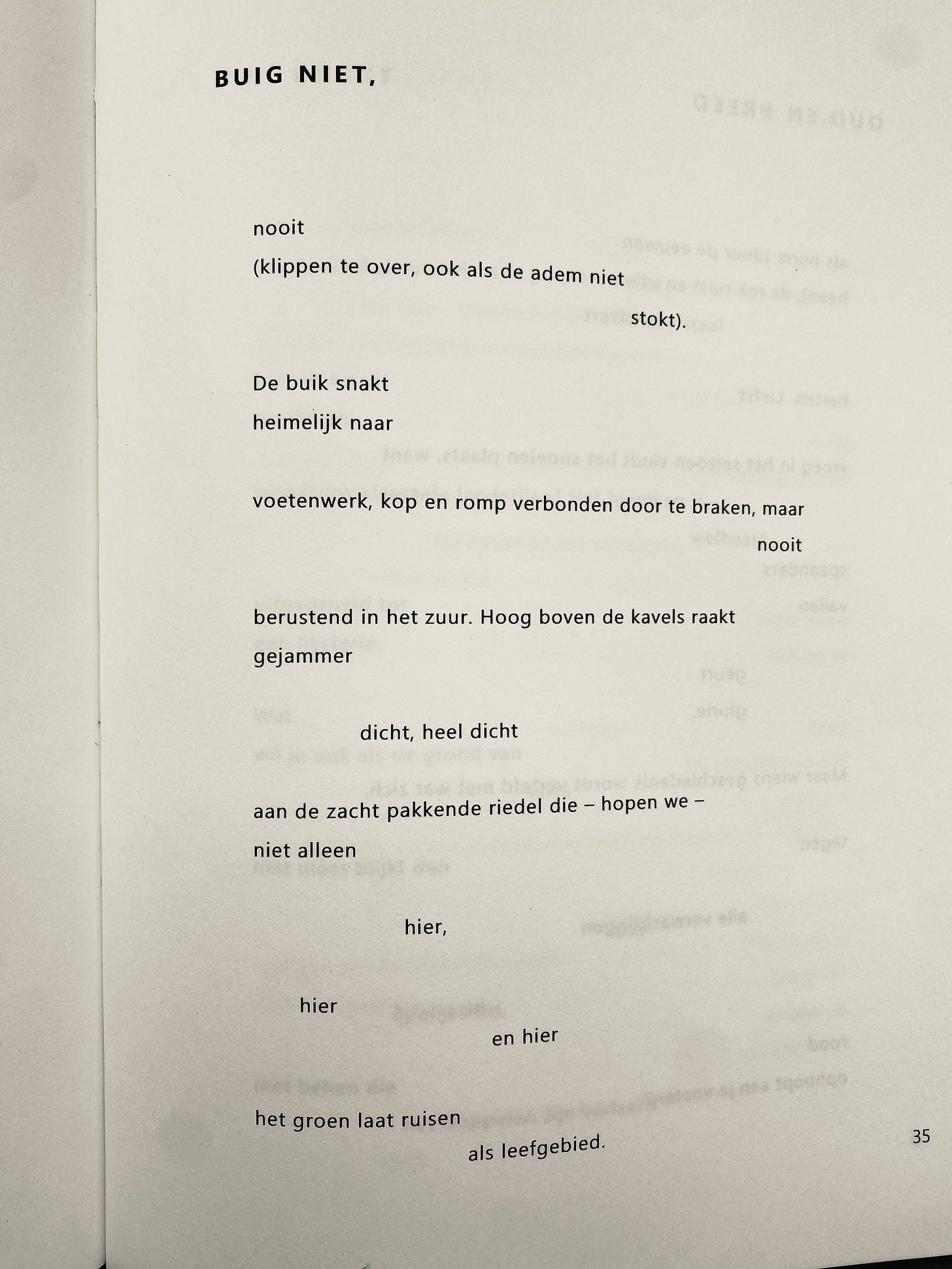 Tijdens de bundelpresentatie van Kop Blijf Aan (Opwenteling, 2025) werd dichter Peter van Lier door een van de sprekers zonder verdere uitleg een mysticus ‘in zekere zin’ genoemd. Nou heb ik Van Lier nog niet op godsdienstige verkondigingen kunnen betrappen, maar dat hij zich in zijn poëzie in eerste instantie richt tot de ziel van de lezer is wel waar. Bovendien laten zijn gedichten zich niet altijd gemakkelijk ontrafelen, bevatten meer dan eens mysterieuze passages. Zo lijken in het openingsvers van de afdeling Fort Europa – ‘Buig niet,’ – illegale immigranten te worden beschreven, die op zoek naar ademruimte hachelijke reizen ondernemen. En lijkt in hun hoop ook hun angst door te schemeren: dat hen géén leefgebied wordt gegund.